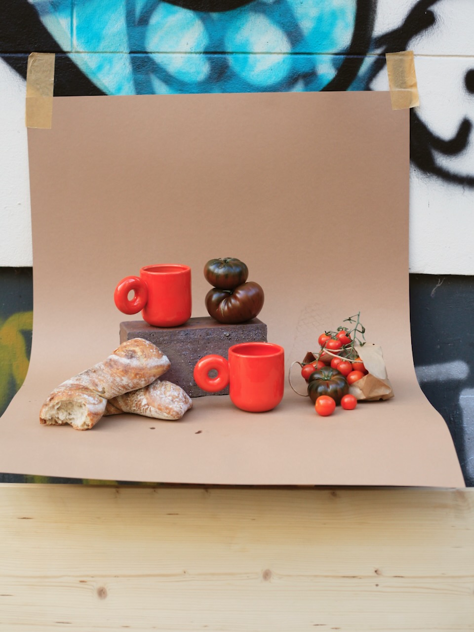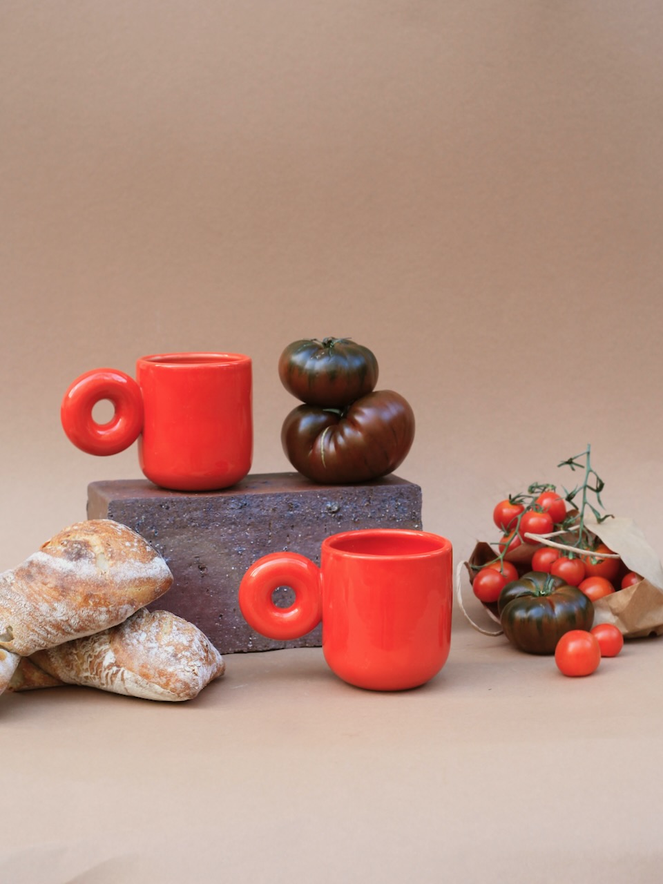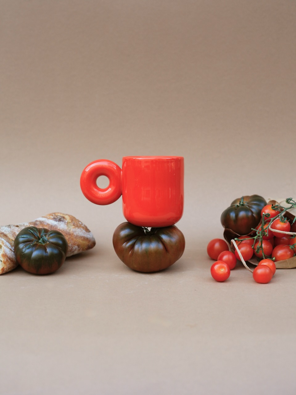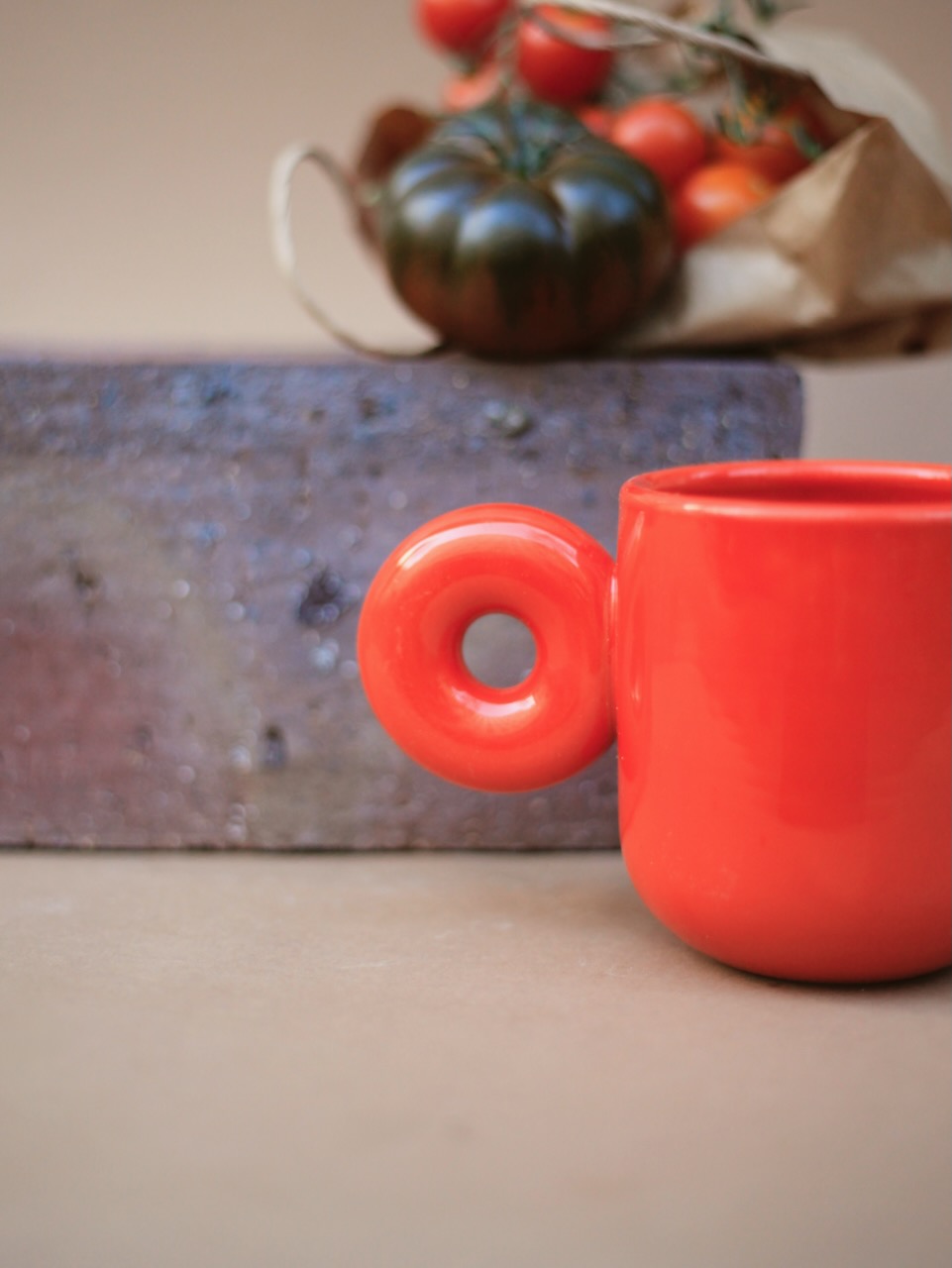 Colourful mug with a joyful donut handle, made of white stoneware clay.