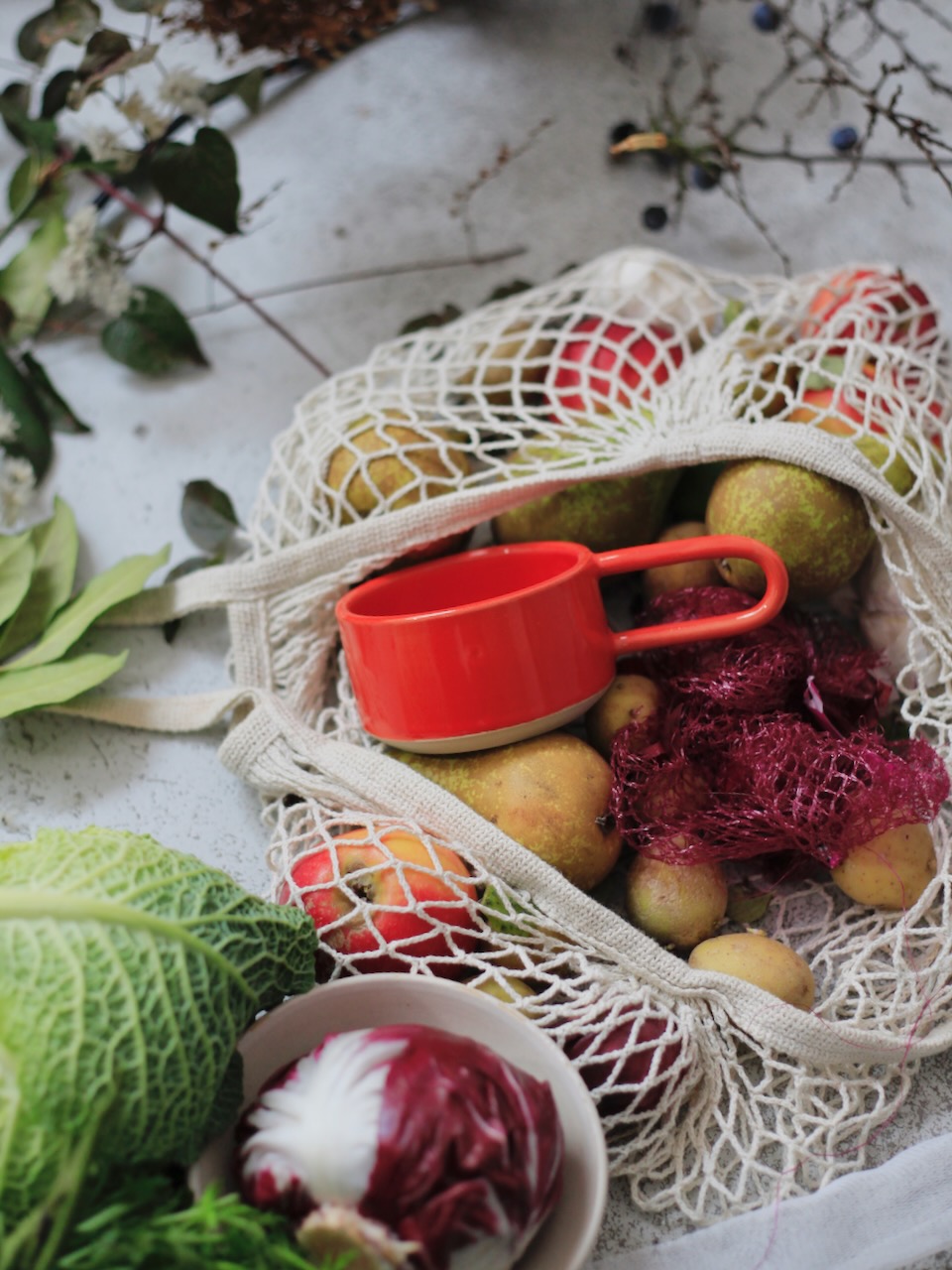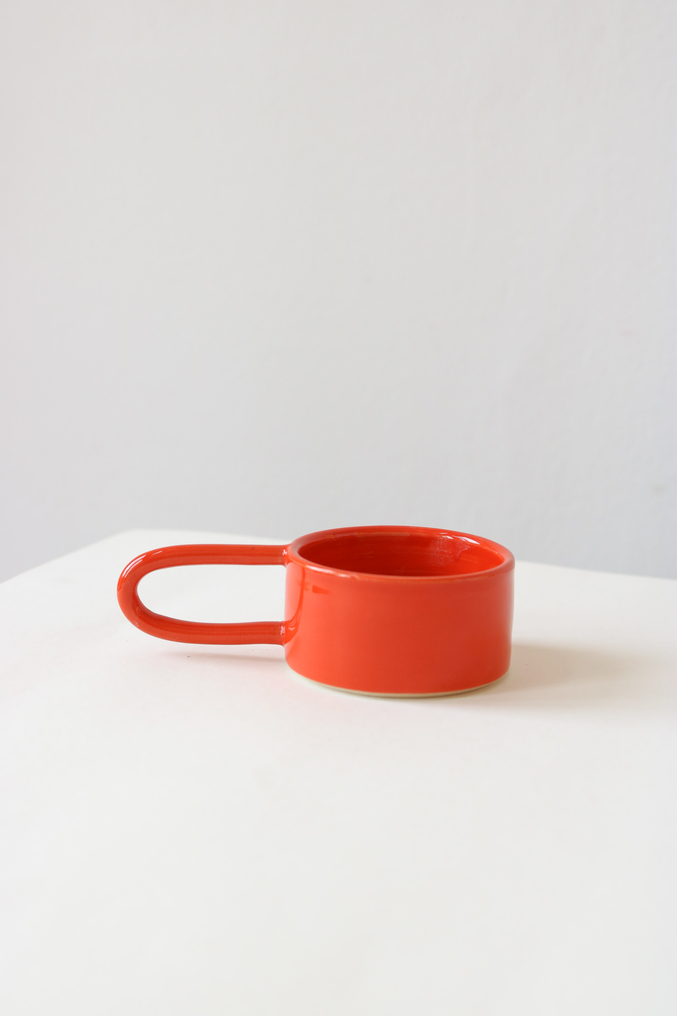 Bright red cup with a ridiculously long, nevertheless not impractile handle.