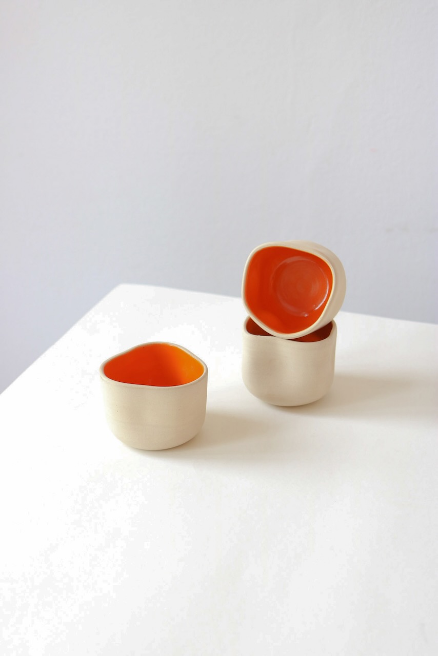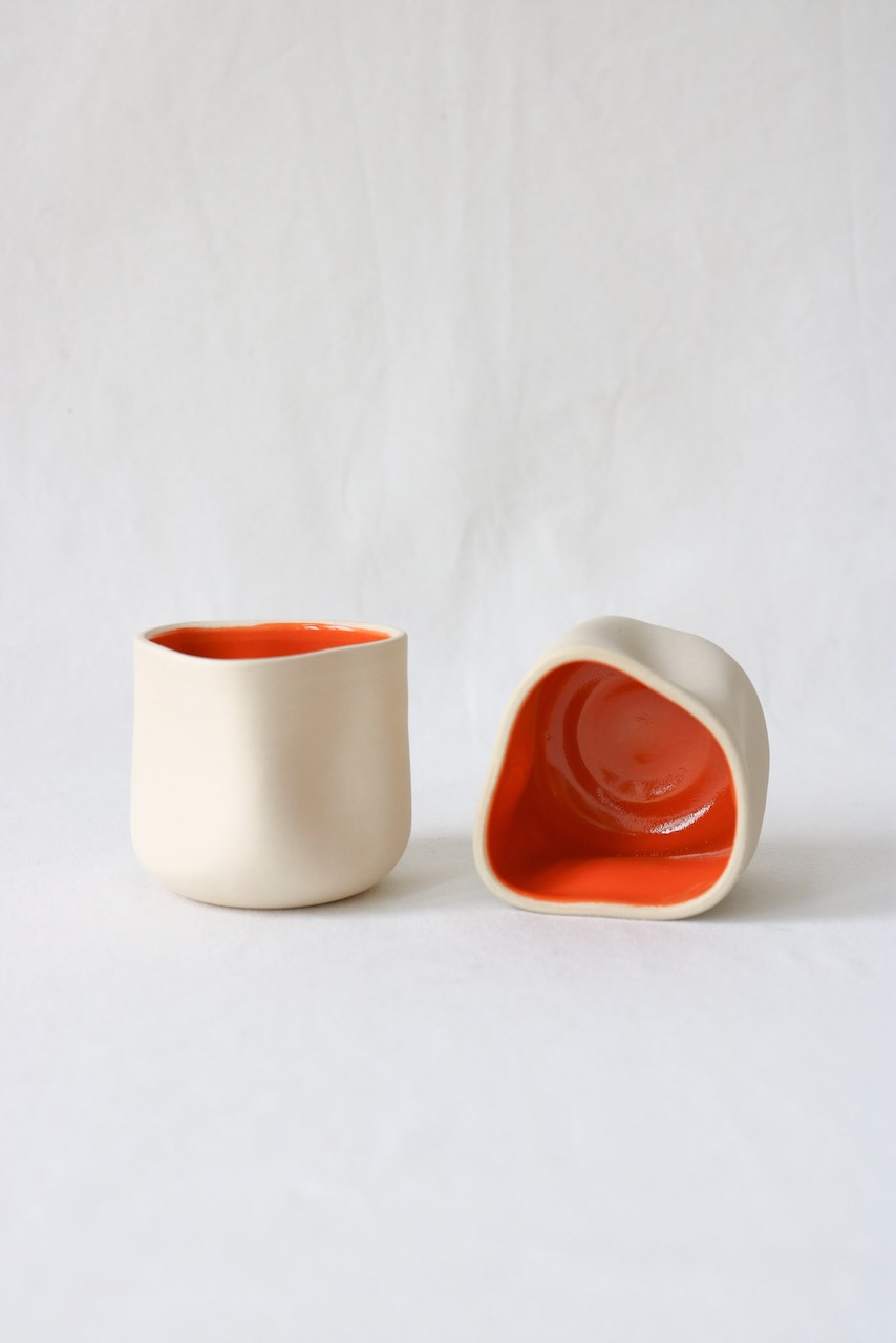 Wonky tumbler, perfect for your coffee in the morning. Made of a white stoneware clay and glazed with a glossy orange glaze on the inside.