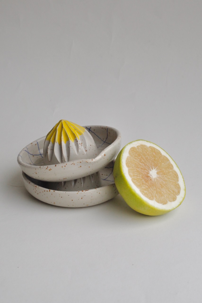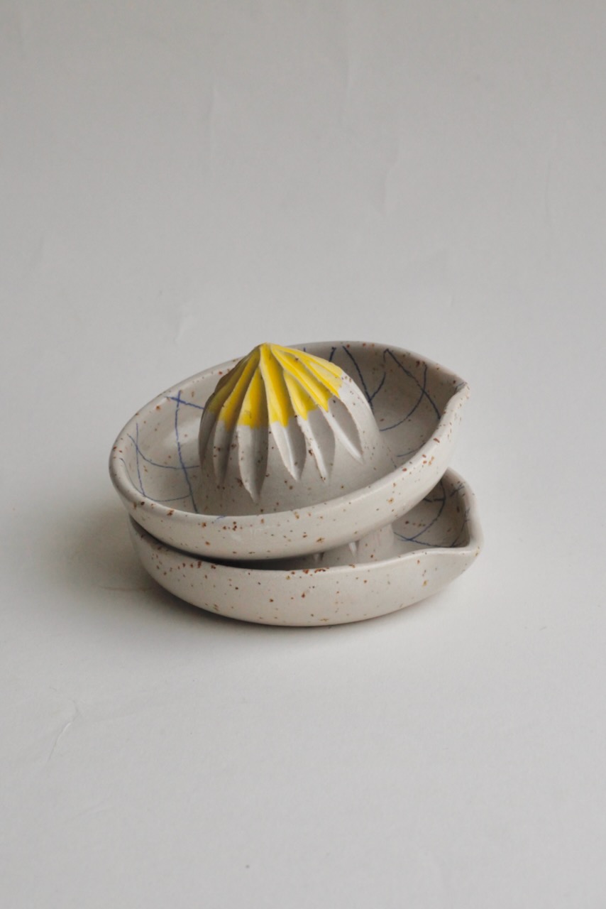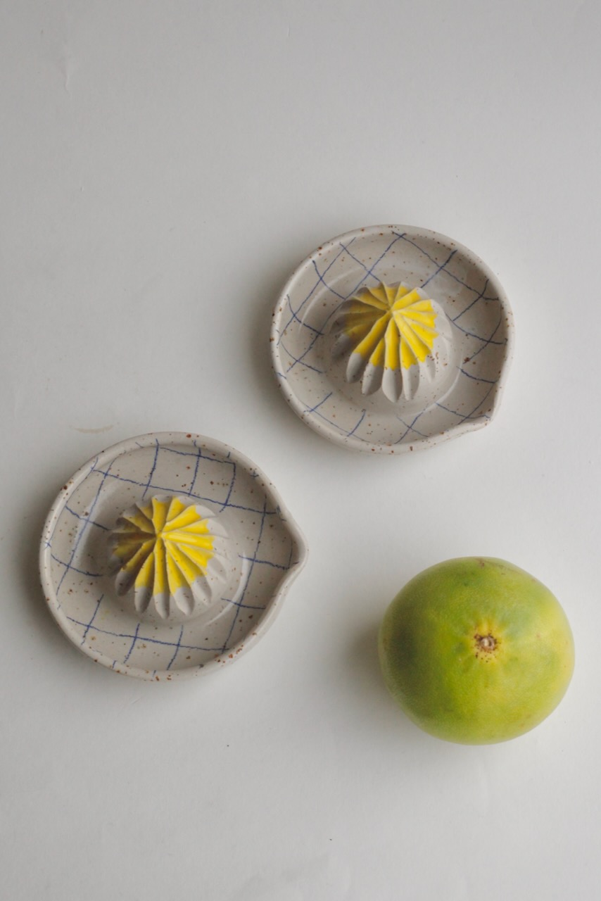 Citrus press with handpainted check pattern and yellow tip. Made of speckled stoneware clay and glazed in white.