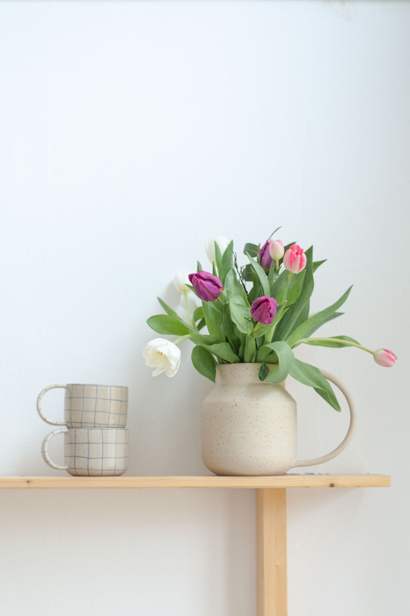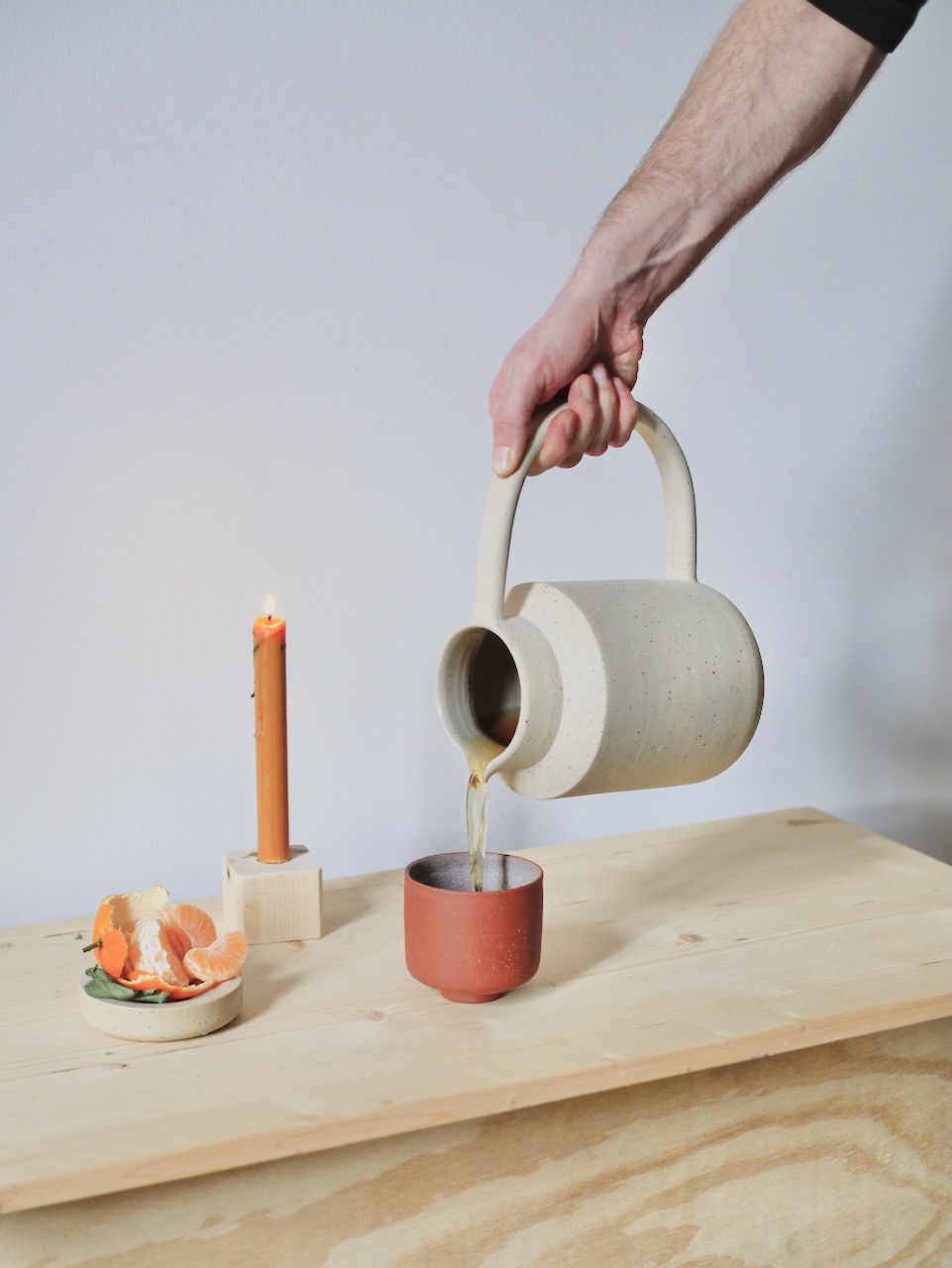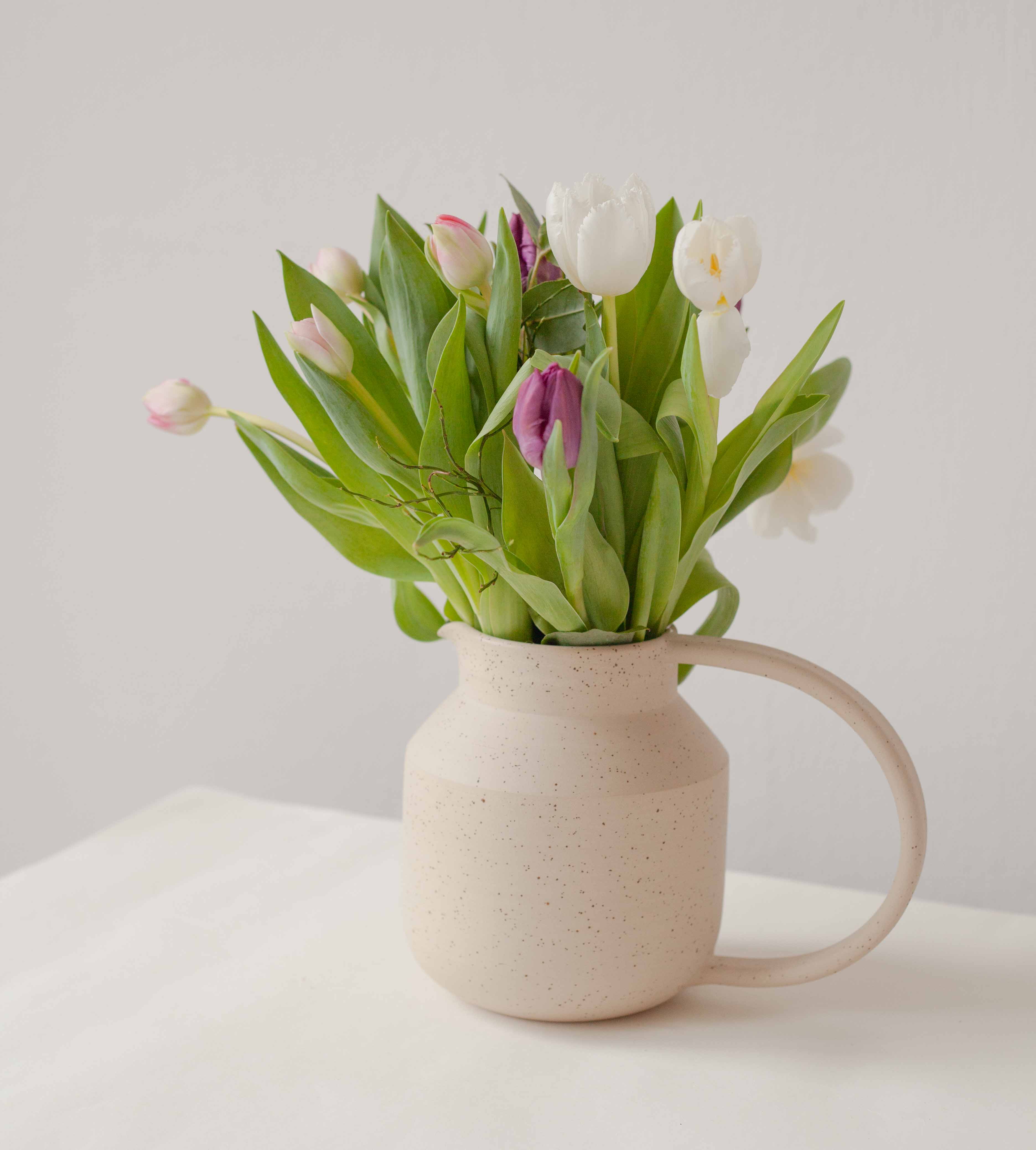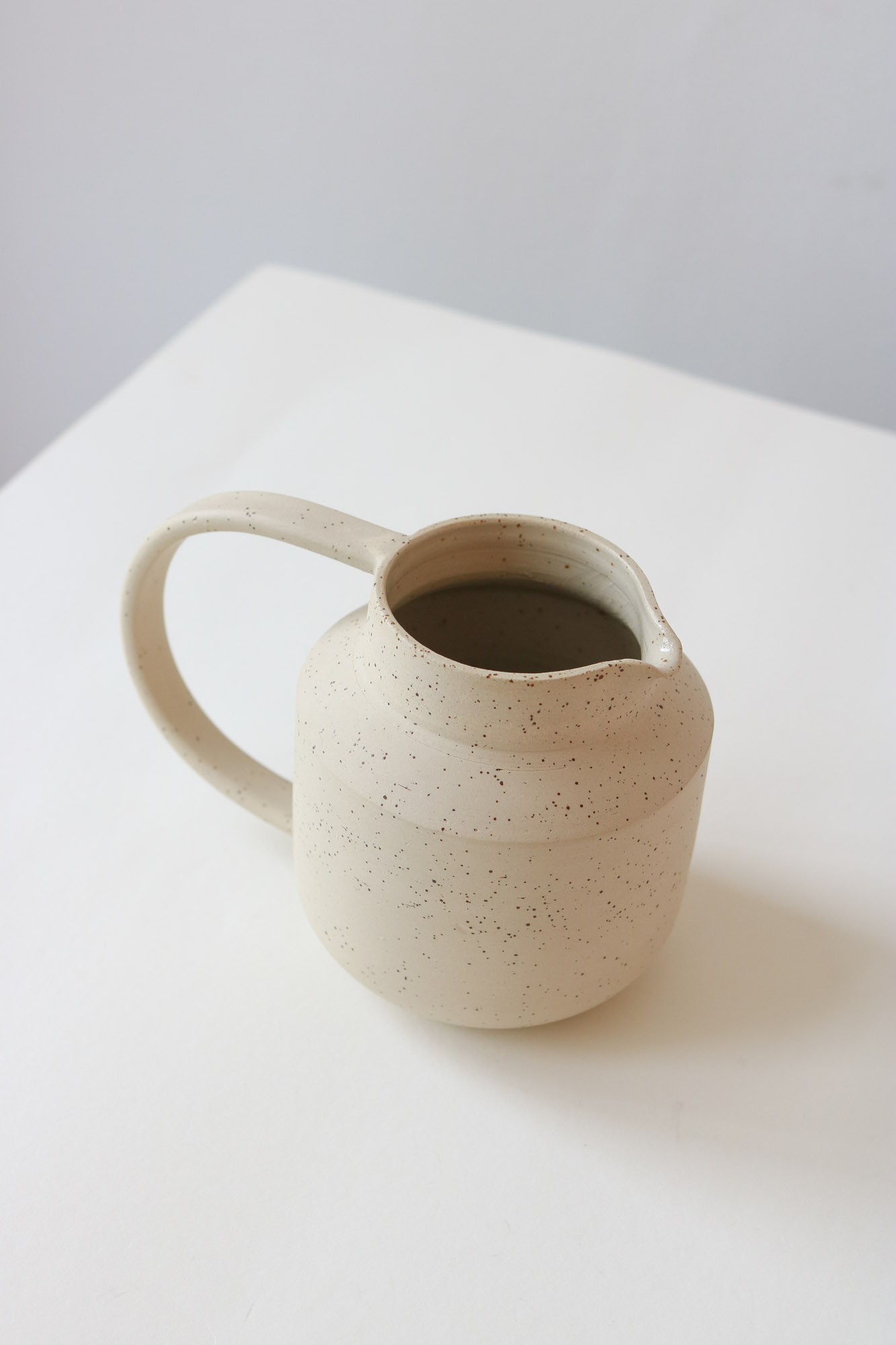 Pitcher made of a white, speckled stoneware clay. Only glazed from the inside. Perfect for water, tea or even to hold some flowers.