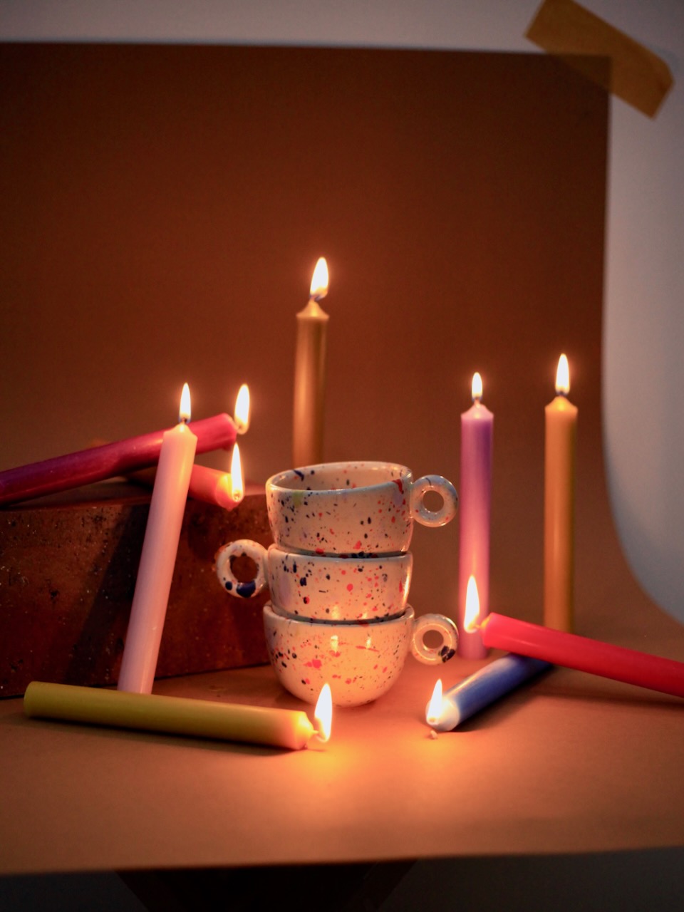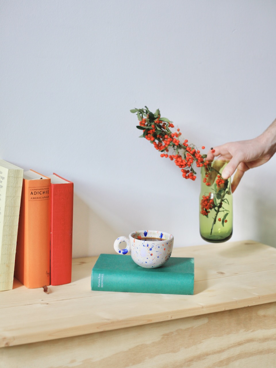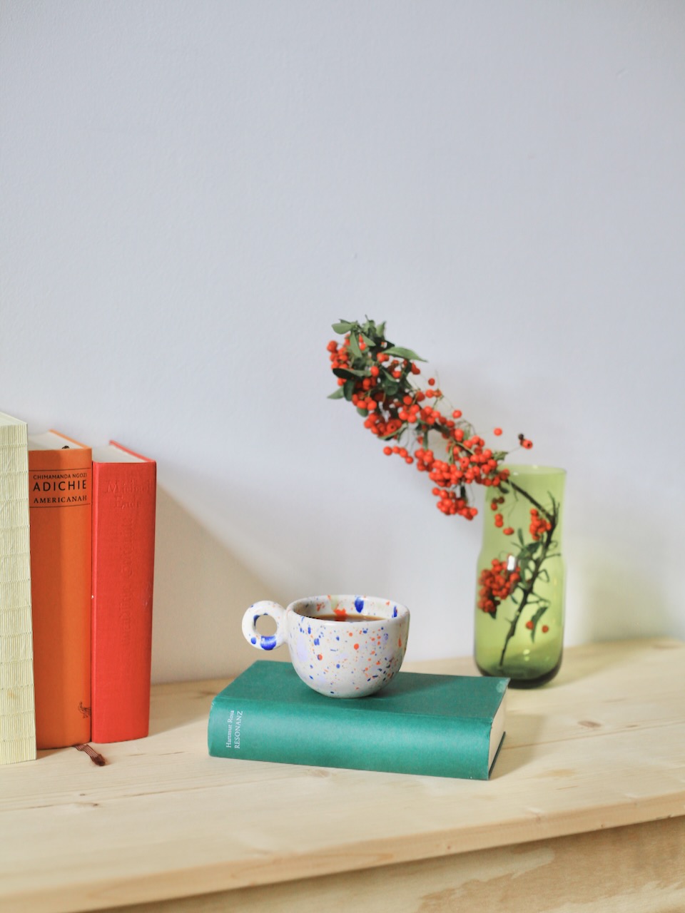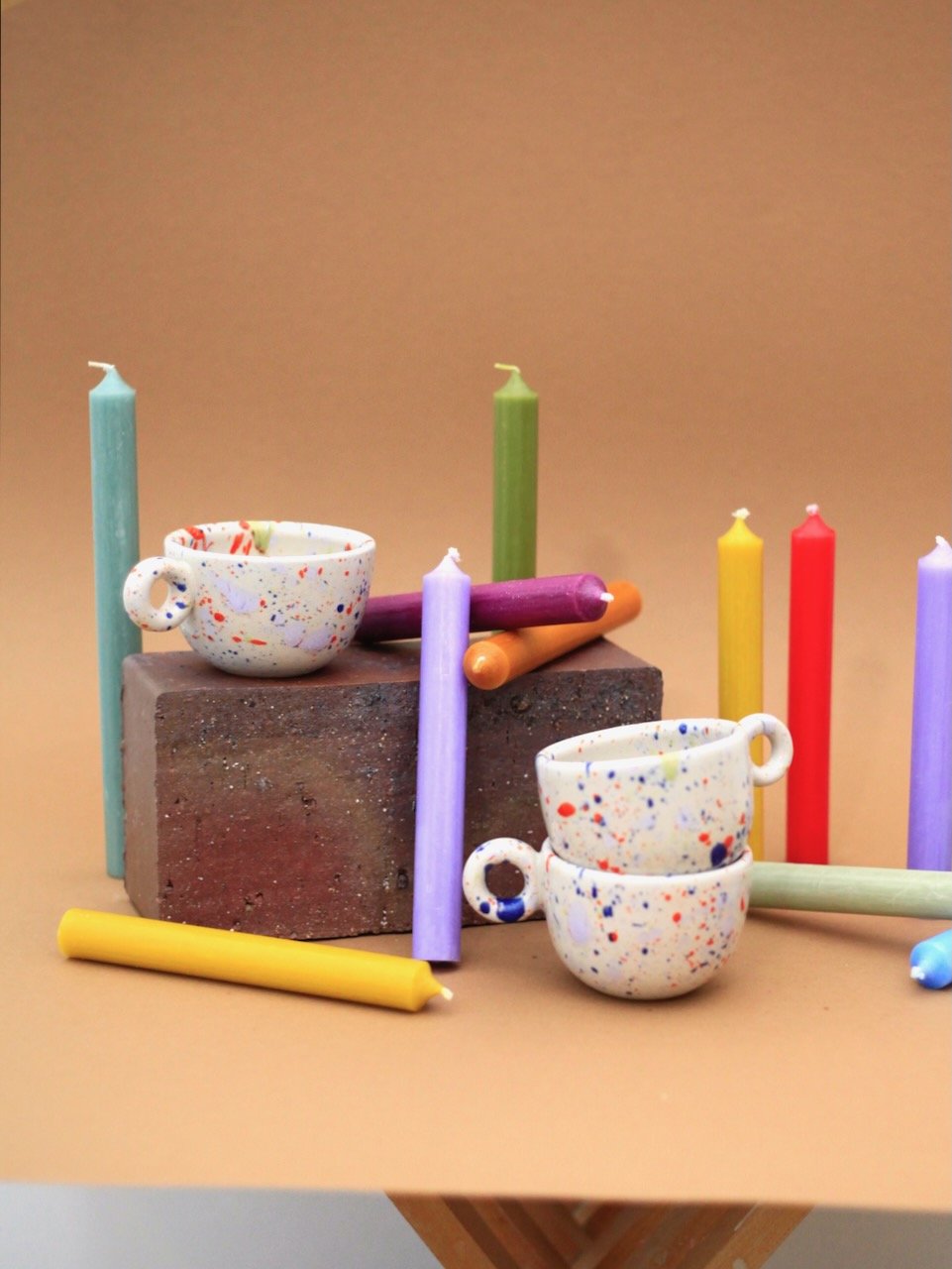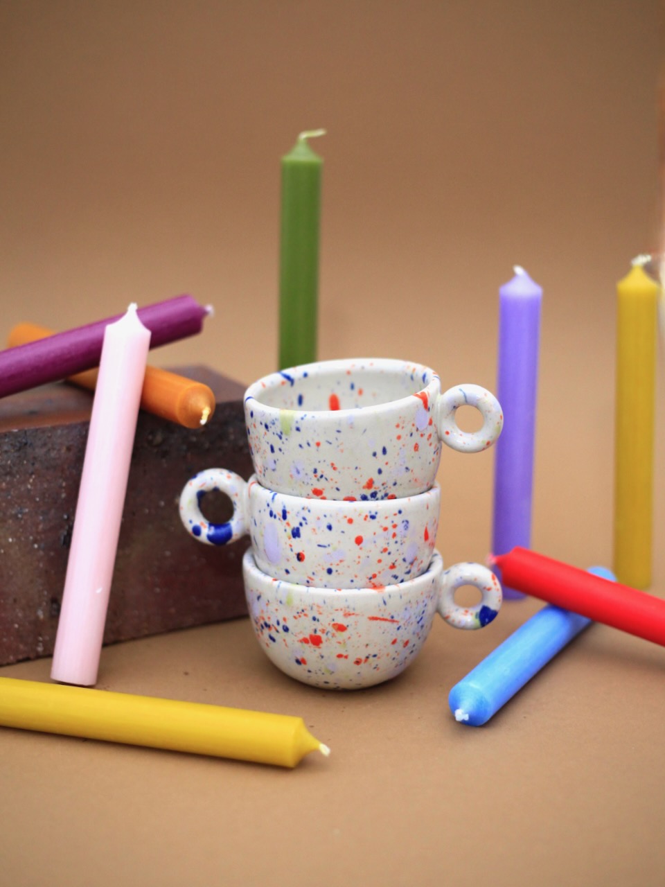 Happy everyday tumbler, made of a white stoneware clay. Glazed in white with colourful sprinkles on it.
