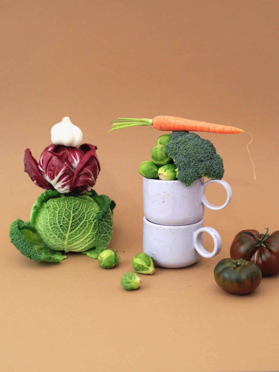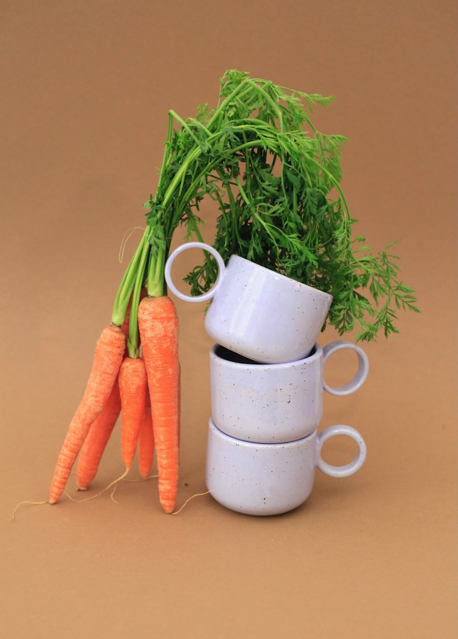 Cup with round handle made of stoneware clay. Glazed in soft lilac with speckles shining through.