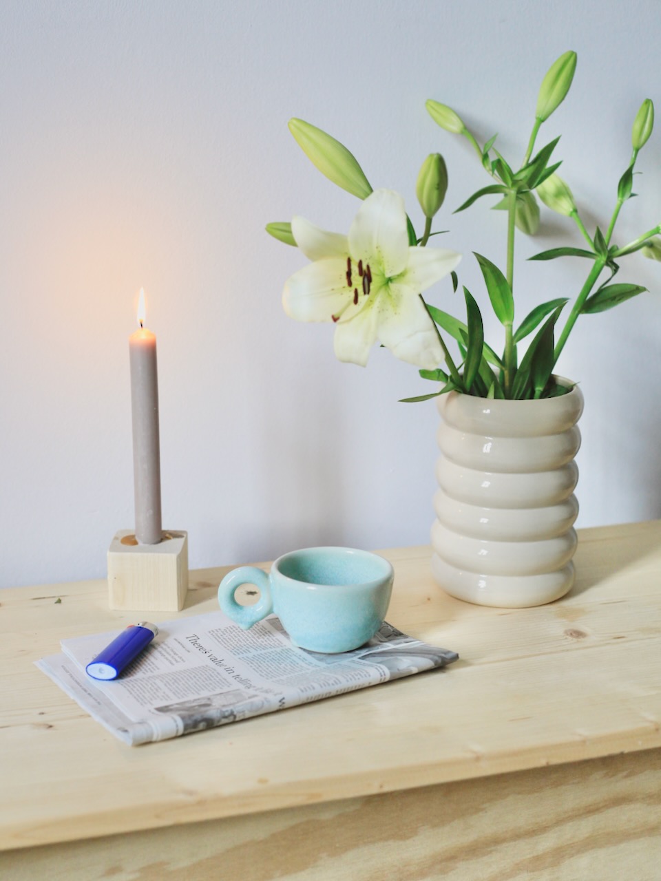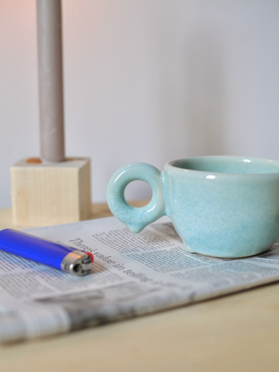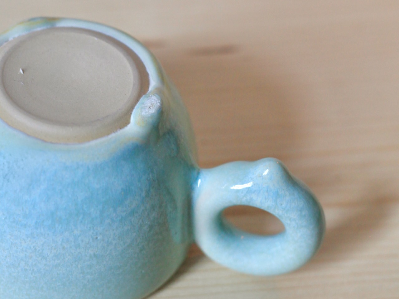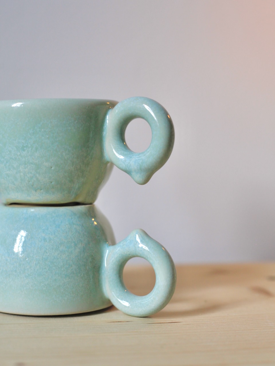 Handled cups, made of stoneware clay. The glaze was applied quite thick, which causes drips on bottom and handle – these ones will remain prototypes forever but still want to find a new home.