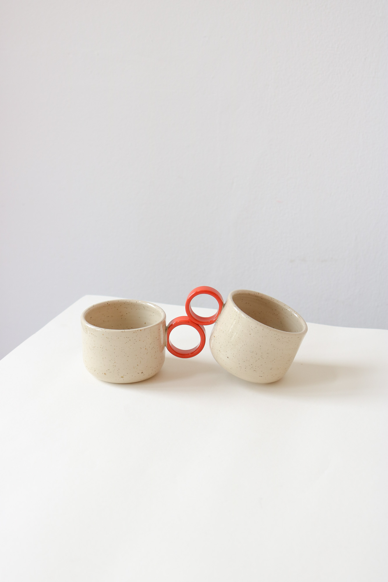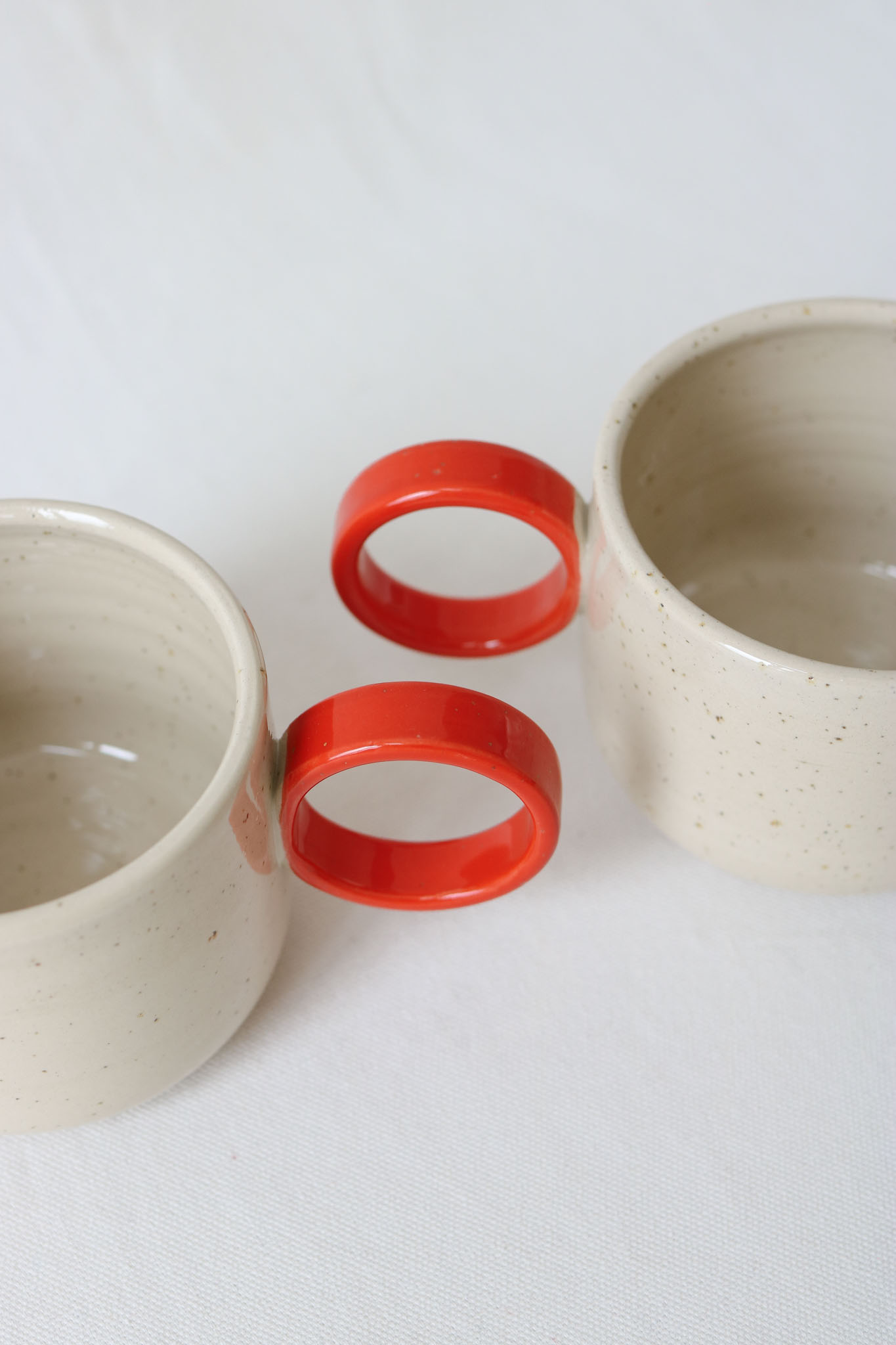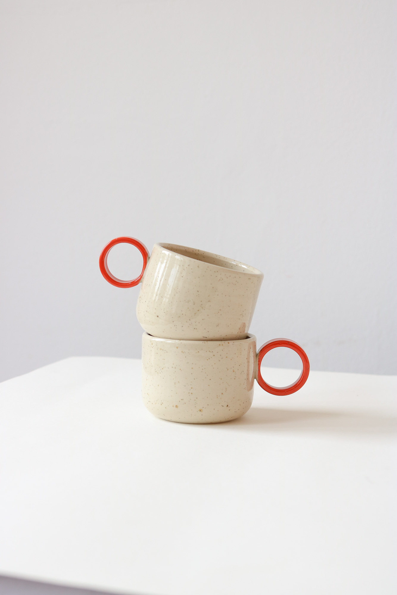 Friendly cup with red, round handle made of speckled stoneware clay with a glossy, transparent glaze.